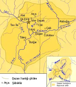 ![]() Mapa del kanato de Kazán en 1540. | |||||||||||||||||||||||||||||||