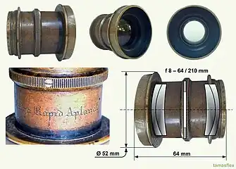 ![]() Carl August von Steinheil, Objetivo fotográfico "Aplanat u objetivo "Rapid Rectilinear" 1866, de gran éxito en retratos fotográficos hasta 1940 |