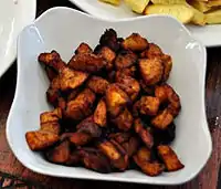 Kelewele es un popular aperitivo ghanés consistente en trozos de plátano fritos y condimentados con especias.[1] En inglés, se le llama a veces Hot Plantain Crisps.[2] En África, el kelewele es vendido por vendedores ambulantes, generalmente de noche.[3][4][5] A veces se sirve con arroz, estofado, maní,[5] o solo como un postre o una merienda.[6] También es popular para el desayuno.[7] Los plátanos se pelan y se puede cortar en trozos o cubos.[5] Por lo general, el jengibre, la Pimienta roja y la sal son los condimentos típicos utilizados para hacerlo.[3][5][8] Sin embargo, la cebolla, anís, Syzygium aromaticum, nuez moscada, la canela y el chile en polvo son también utilizados como especias.[3] El aceite debe estar caliente y el plátano no debe estar demasiado blando, o absorberá demasiado aceite.[9] Se deja cocer hasta que el azúcar en los plátanos caramelice, con bordes marrones.[8][9]