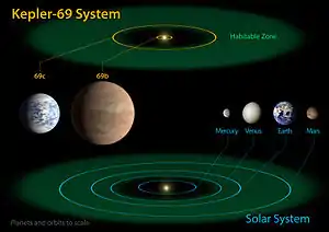 ![]() Comparación del Sistema Kepler-69 con el Sistema Solar | ||