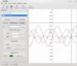 KmPlot es un programa informático libre que permite trazar funciones matemáticas para aprender las relaciones entre éstas y su representación gráfica en un sistema de coordenadas.[1] Forma parte del paquete educativo kdeedu en el entorno de ventanas KDE y se distribuye bajo la licencia GNU. Incluye un potente procesador y permite trazar diferentes funciones de forma simultánea y combinar sus elementos para construir nuevas funciones.
