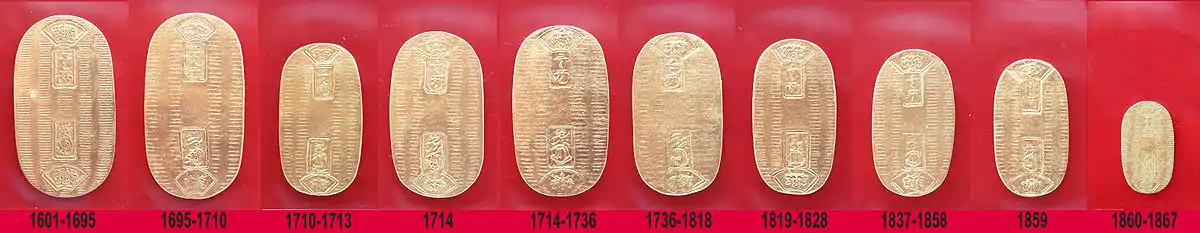 La economía japonesa anterior a 1850 estaba basada principalmente en el arroz. La unidad de medida estándar era el koku, la cantidad de arroz necesaria para alimentar a una persona en un año. Los granjeros pagaban sus impuestos con arroz, que pasaba a formar parte de las arcas del gobierno central, y de manera similar, los vasallos eran pagados anualmente con un determinado koku de arroz. Sin embargo, los portugueses que llegaron a Japón en la década de 1550 preferían el oro al arroz y el koban, que equivalía a 3 koku de arroz, se convirtió en la moneda oficial para el comercio exterior.