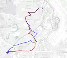 - Dentro del barrio Alameda de Osuna, circula por las calles Manuel Aguilar Muñoz, Avenida de Cantabria, Plaza del Mar, Avenida de la Hispanidad y la vía de servicio de la A-2 en vez de hacerlo por el Paseo de la Alameda de Osuna, Carabela, Corbeta, Manuel Aguilar Muñoz y Los Brezos.