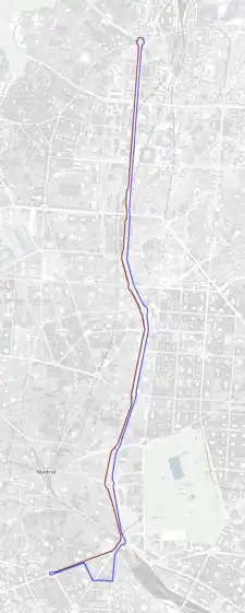 La línea inicia su recorrido en la desembocadura del Paseo de la Castellana en la Plaza de Castilla, desde este punto toma el Paseo de la Castellana hacia el sur.