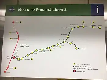 La línea 2 del metro, que contaba con 16 paradas cuando se inauguró y cuyo coste ha superado los 2.000 millones de dólares para su construcción original, conectaba en aproximadamente 35 minutos los barrios orientales de Nuevo Tocumen y 24 de Diciembre con el distrito norteño de San Miguelito, donde enlaza con la Línea 1, en funcionamiento desde 2014.