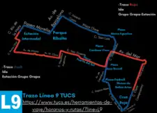 La línea 9 del Transport Urbà de Castelló (TUCS) conecta la Estación Intermodal con el Grupo Grapa, atravesando la ciudad de oeste a este, circulando por la Avda. Barcelona, Joaquín Costa, plaza Clavé, plaza Mª Agustina, Gobernador, plaza Borrull, Avda. Valencia hasta el Grupo Grapa. La vuelta circula por Avda. del Mar, Gasset, San Vicente, Avda. Dr. Clará, Avda. Alcora hasta la Estación Intermodal. La página web oficial de TUCS, indica que esta línea es una línea circular, similar a la línea 8 y la línea 18.[1]