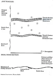 La profundidad de tales posiciones podría oscilar entre varios cientos y varios miles de metros, y en algunos casos mucho más lejos. Si la posición se mantenía en gran profundidad, se podría construir una línea de fortalezas y puestos avanzados fortificados -diseñados para retrasar y desorganizar un ataque enemigo- hacia adelante de la LPR, y una línea de reserva construida detrás de ella.
