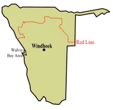 La demarcación se creó en 1896 con la esperanza de contener un brote de peste bovina en la colonia alemana imperial del sudoeste de África. El Fuerte Namutoni se construyó como una estación de policía para controlar los viajes de norte a sur de la población indígena y su ganado; la línea se prolongó hasta Okaukuejo en el oeste y Otjituuo en el este. Sin embargo, la epidemia llegó a Windhoek en 1897, arrasando con la mitad de la población ganadera del pueblo Herero.[3] Su nombre proviene de la representación en tinta roja de un mapa de 1911 creado por la administración colonial alemana.[4] La «Línea Roja» fue cambiada varias veces y desde los años sesenta se utilizó también para aislar los brotes de fiebre aftosa en el norte de las granjas del sur.