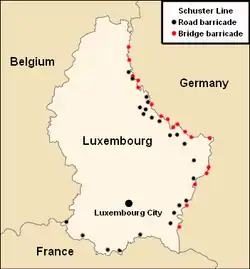 La línea Schuster constaba de cuarenta y un juegos de bloques de hormigón y puertas de hierro; dieciocho bloqueos de puentes en la frontera alemana y cinco bloqueos de carreteras en la frontera francesa.[2] Las barricadas se colocaron a una milla en el interior del país siguiendo un patrón en zigzag, cubiertas por densas barreras de alambre de espinos a ambos lados. Se erigieron nueve puestos de radio a lo largo de la frontera alemana, con una estación receptora central en el cuartel de St Espirit en la capital.[3]