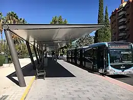 Las paradas de la línea de Alta Capacidad poseen marquesinas diferentes a las del resto de líneas de bus urbano. Las paradas del LAC, con una disposición propia de un andén, se encuentran elevadas y tienen una longitud equivalente a la de los autobuses a fin de permitir el acceso y salida por todas las puertas del vehículo. Todas las paradas son accesibles a personas con movilidad reducida, poseen paneles electrónicos de información al viajero y máquinas automáticas de adquisición y recarga de títulos de transporte.[12]
