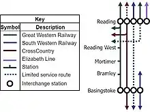 La Línea de Reading a Basingstoke es un enlace ferroviario entre Línea Principal del Sur Oeste y la Línea Principal del Great Western, construido por el Great Western Railway entre 1846 y 1848. Cuenta con servicios locales del GWR entre Reading y Basingstoke, con parada en las estaciones intermedias de Reading West, Mortimer y Bramley. La línea también es una ruta importante para los servicios de carga y pasajeros de mayor distancia: los servicios CrossCountry de Bournemouth y Southampton a Birmingham y el norte de Inglaterra y los trenes de carga entre el Puerto de Southampton y las Midlands utilizan la línea. Los servicios de fin de semana de South Western Railway también operan entre Reading y Salisbury.