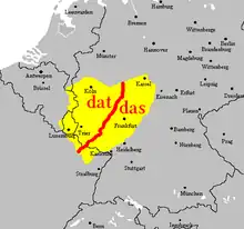 Dentro del ámbito territorial del alemán central occidental, divide las variedades del fráncico moselano (dat) de las del fráncico renano (das).