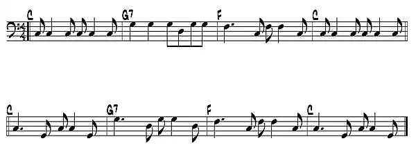 - Walking "a dos" sobre un acorde C-7. De uso generalizado en baladas o como acompañamiento para la melodía. Nótese como el bajo emplea un patrón tónica-quinta (C-G)