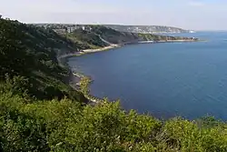 Parte de la costa de Dorset (Inglaterra), que se dispone hacia el norte desde la lcaliza de Portland en Durlston Head, es un ejemplo claro de un línea de costa discordante. La caliza de Portland es resistente a la erosión; mientras al norte hay una bahía en Swanage donde el tipo de roca es una arenisca verde blanda. Al norte de Swanage, el afloramiento de tiza crea el promontorio que incluye Old Harry Rocks.