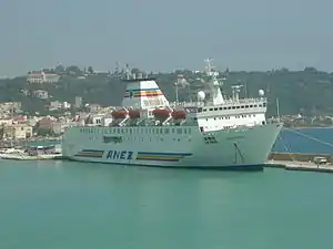 Ferry atracado en un muelle, en el que se puede ver la línea de flotación marcada por el agua