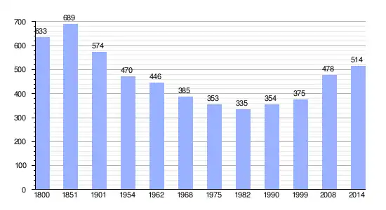 Los datos demográficos contemplados en este gráfico de la comuna de L'Hôtellerie-de-Flée[4] se han cogido de 1800 a 1999 de la página francesa EHESS/Cassini, y los demás datos de la página del INSEE.[5]