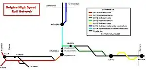 El trazado comienza en Lieja hacia el este por la línea "clásica" que ha sido modernizada para circular hasta 160 km/h. En Chênée comienza la línea de alta velocidad propiamente dicha, que es de nueva construcción y admite velocidades de entre 220 y 250 km/h. Poco después de Walhorn la trazado retorna a la línea "clásica" que ha sido habilitada para circular hasta 160 km/h, atraviesa el viaducto Hammerbrücke (enteramente reconstruido como parte del proyecto) y 2 km más adelante llega a la frontera con Alemania.