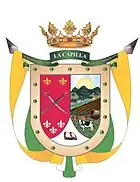 - El escudo integran una bordura dorada con 15 piezas sinoples, al interior se parte en tres piezas honorables, siendo en fondo de gules a la izquierda un par de flor de lis doradas en la superior, un par de espadas cruzadas y un trio de flor de lis plateadas; en el de la derecha, un paisaje rural con sus respectivos elementos (montañas, bosque, tierra arable, ganado y una vasija) y en la pieza inferior plateada, un libro abierto, que corresponde a la educación.
