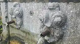 Se trata de una fuente de reducidas dimensiones, que consta de una pileta adosada a una fachada en la que se ubican dos caños incrustados en sendas máscaras o rostros antropomorfos. Por encima de los caños, un entablamento clásico con su correspondiente cornisa proporciona a la fuente un aspecto monumental. El conjunto se ve coronado por un frontón mixtilíneo, que hace de marco a su vez a una pequeña lápida dedicatoria. Unas volutas o motivos vegetales sirven de ornamento a los extremos de dicho frontón. Todo el conjunto se ve flanqueado por una suerte de bancos o canapés muy al gusto clasicista de la época.