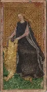 - En algunos tarots aparecer la mujer con un manto, en otros, como el Tarot Rider, La Fuerza aparece con hierbas en la cabeza y alrededor de la cintura, en este último caso al fondo de la imagen aparece un bosque y una montaña.