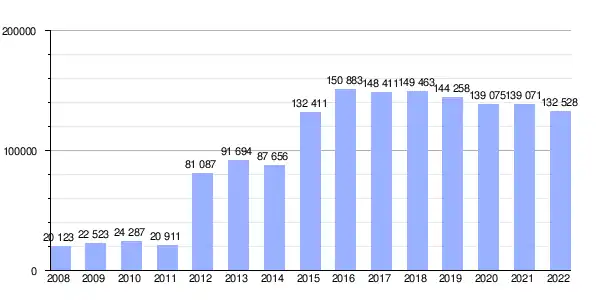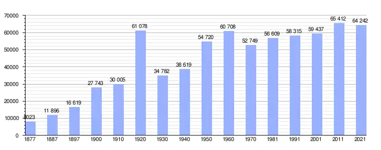 | Gráfica de evolución demográfica de La Línea de la Concepción[19] entre 1877 y 2021 |