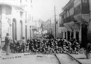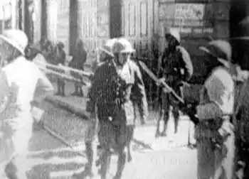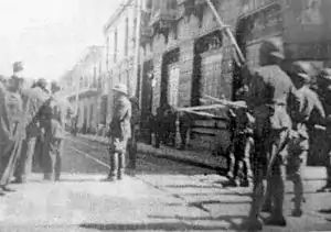 Exactamente a las 3:00 y 1 minuto de la tarde, el Alférez de la Guardia Civil José Torreblanca hizo sonar su silbato y, como si hubieran estado esperando esa señal, las ametralladoras y los fusiles emplazados en las chacras comenzaron a hacer fuego. La gente del Alférez Torreblanca se desplegó como un abanico por el tramo de tierra desde la última cuadra de la calle 2 de Mayo y se dirigió resueltamente con las varas en una mano y la pistola en la otra, hacia la única puerta que existía en esa área y que, lamentablemente no había sido reforzada adecuadamente, porque por allí entraba y salía la familia del portero Narciso Salas, una lluvia de mitades de ladrillo atajó en la mitad de la calle la primera ola de policías.