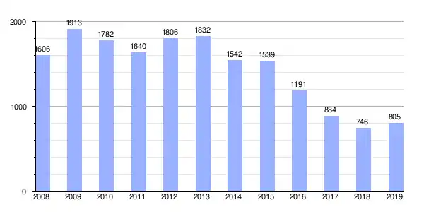 | Gráfica de evolución demográfica de La Roda de Andalucía[2] entre 1842 y 2021 |