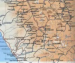 El mapa muestra la carretera hacia La Unión, a partir de la localidad de Paramonga de las porciones limítrofes de las regiones de Ancash, Huánuco y Lima.