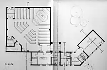 Este conjunto está compuesto por dos elementos, uno de ellos reservado a labores administrativas y el otro a clínica médica, que mantienen un eje direccional con la iglesia y las escuelas. Se refuerza así la forma hexagonal sugerida por la plaza de viviendas al convertirse en un edificio esquina dentro de la plaza. Destaca especialmente la torre-edificio de planta octogonal, destinada como sala de reuniones y que cumple también la función de depósito de agua.
