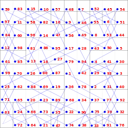 La decisión de dónde colocar cada objeto viene determinada por un bicuadrado latino ortogonal de orden 10: en cada cuadro de la cuadrícula de 10×10, se incluye un par ordenado de dígitos, de modo que cada dígito está presente una sola vez en cada línea y en cada columna, y además no existen dos cuadros que contengan el mismo par ordenado. Así, cada capítulo tiene un par (a,b) asociado, lo que significa incluir en dicho capítulo a elementos de la primera lista, y b elementos de la segunda lista. Por ejemplo, como el capítulo 3 tiene asociado el par (2,5), entonces en este capítulo deben usarse los elementos 1-1-2, 2-1-2, ..., 21-1-2, así como los elementos 1-2-5, 2-2-5, ..., 21-2-5. Esta estrategia, no obstante, no es utilizada de manera tan estricta, pues el autor se permite escoger en ciertos casos algunos elementos de sublistas particulares, y además permutar el bicuadrado latino ortogonal, sobre la base de lo que en matemáticas se conoce como una pseudo-quenina de orden 10, aumentando así las posibilidades de elección.[5]