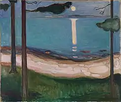 El cuadro Luz de luna del Museo Nacional de Arte, Arquitectura y Diseño Noruego, pintado en 1895, es más o menos una versión de La voz sin la figura en primer plano. Según Ulrich Bischoff, esto ha convertido a la columna lunar en "el verdadero actor principal". Lo que queda es el espacio de la imagen en sí mismo y su tensión, que obtiene del contraste entre las líneas verticales y horizontales (es decir, "masculinas" y "femeninas"). Lo que queda es la aplicación suave de pintura, los contrastes de luz y oscuridad y las imágenes que atraviesan muchos motivos del "friso de la vida": la línea de playa de Åsgårdstrand, los troncos desnudos de los árboles con ramas individuales que se simplifican a velas triangulares, la luz de la luna que se abre al mar como una columna de color, cuya forma recuerda a un tubo de ensayo. Incluso en Luz de luna la perspectiva no se acorta, lo que significa que todo el paisaje se eleva tan abruptamente como los troncos de los árboles paralelos. Esto resalta el "color que fluye suavemente", por ejemplo, en la transición de la orilla al agua.[26]