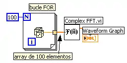 La Figura 1 muestra un Diagrama de Bloques de un programa en el que se genera un array de 100 elementos aleatorios, a continuación se hace la FFT de este array y se muestra en una gráfica:
