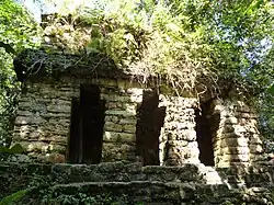 Las construcciones entre la que destacan una plaza, algunos templos y pirámides se encuentran cubiertos de vegetación selvática, el resto de la zona identificada como una acrópolis está enterrada en la selva y permanece sin explorar a fondo.[1]