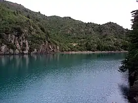 - Tiene una superficie de 119 km2. y un perímetro de 70.5 km., su ancho es de 8 km. y su longitud de 12 km. Se caracteriza por el color de sus aguas de color verde turquesa con abundantes especies de trucha salmonídeas, especialmente en el sector denominado Cacique Blanco. El lago está encajonado entre cordones montañosos destacando el de la Sierra Negra. Sus aguas fluyen por el río Figueroa hasta el lago Rosselot.