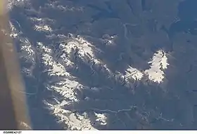 ![]() En la sección superior central se observa la laguna, como un trébol de tres hojas. En la foto satelital, las direcciones son las contrarias a las usuales: el norte es hacia abajo y el oeste hacia la izquierda. | ||