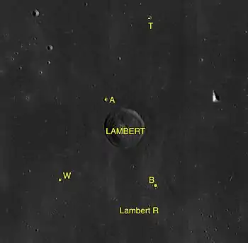 Lambert es un cráter de impacto lunar situado en la mitad sur de la cuenca del Mare Imbrium. Se encuentra al este y algo al sur del cráter ligeramente más grande Timocharis. Al sur aparece el cráter Pytheas más pequeño, y a cierta distancia al oeste-sudoeste se halla Euler.