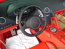 La palanca de cambios y la selectora son de acero, como es tradición en Lamborghini; junto a ellos se encuentran los botones del elevalunas, el de las luces de emergencia y el de la tapa del tanque de combustible, cuya capacidad es de 100 litros (26,4 galAm).