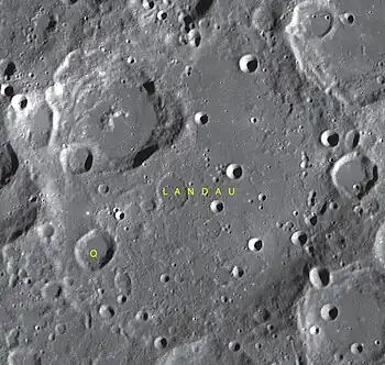 Landau es un gran cráter de impacto que se encuentra en el hemisferio norte de lacara oculta de la Luna. Fue nombrado en memoria del físico Lev Landau. El cráter Wegener está unido al borde noreste. Junto al borde sureste se halla Frost.