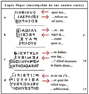 - Esta obra contiene una traducción derivada de «Lapis Niger» de Wikipedia en inglés, publicada por sus editores bajo la Licencia de documentación libre de GNU y la Licencia Creative Commons Atribución-CompartirIgual 4.0 Internacional.