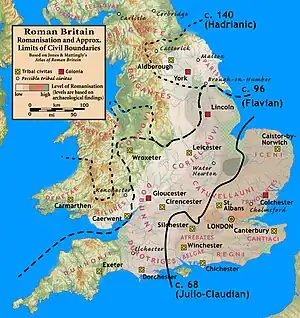 Los historiadores del período romano en Inglaterra distinguen unas "tierras altas" al norte y el oeste del país y unas "tierras bajas" al sur y el este,[4] siendo esta última región la que presentaba un mayor grado de romanización.[5] En particular, en estas tierras bajas, el latín habría sido la lengua de la mayor parte de la población urbana, la única lengua de la administración, de las clases altas, del ejército y, tras la introducción del cristianismo, la lengua de la Iglesia. El britónico habría seguido siendo usado por parte del campesinado, que formaba el grueso de la población y era bilingüe; la élite rural habría sido romanizada y en algunos casos bilingüe.[6] En las tierras altas, solo había una romanización muy limitada, y el britónico habría sido la lengua dominante en todos los ámbitos, pero las ciudades principales estaban bastante romanizadas.[7] De todos modos hay historiadores —como Theodor Mommsen en su libro "Las provincias del Imperio romano"— que afirman que casi toda la Britannia romana al sur del muro de Adriano en el inicio del siglo V era prácticamente romanizada.