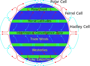 Las latitudes del caballo están asociadas con el anticiclón subtropical y el descenso a gran escala de las corrientes de aire a gran altitud que se mueven hacia los polos. Después de llegar a la superficie de la tierra, este aire se propaga hacia el ecuador, como parte de los vientos alisios predominantes o hacia los polos, como parte de los vientos del oeste.[1]