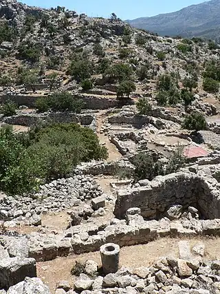 El yacimiento comprende la acrópolis, el ágora, el pritaneo, el templo y el teatro. La entrada principal se encuentra al oeste del yacimiento donde un camino escalonado lleva al ágora. El centro de la ciudad está en la cima de la colina, y desde aquí la vista hacia el puerto antiguo de Lato, Ágios Nikolaos, es magnífica. Al sudoeste se encuentran los restos de un templo y la zona del teatro, en el que probablemente había asientos para 350 personas. Además la ciudad contaba con un pritaneo (edificio administrativo).[5][4]