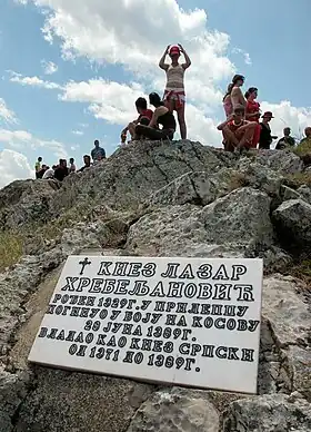 Maldición de Kosovo:![]() La inscripción de la maldición se encuentra en el monumento de Gazimestan. «Aquel que sea serbio y serbio de nacimiento, —El zar Lazar maldice a todos los que no tomen las armas contra los turcos otomanos en la batalla de Kosovo.[78] |