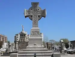 - Cruz celta (1888): se trata de una monumental cruz patada de estilo céltico de piedra de Montjuïc que preside el tercer recinto del cementerio, el creado por Albareda. Este espacio había sido una fosa común, por lo que la cruz se dedicó a los fallecidos anónimos del cementerio. Se sitúa sobre una escalinata de cinco escalones, y presenta una decoración esculpida en relieve de elementos vegetales, como espinas, hojas y flores de adormidera.[12]