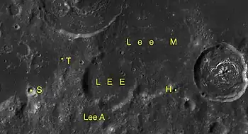 Lee es el remanente inundado de lava de un cráter de impacto, situado en una entrada del Mare Humorum, en la parte suroeste de la Luna. Al este se encuentra el cráter Vitello, y justo al norte se halla el cráter también inundado de lava Doppelmayer.