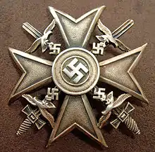 La Cruz española (Spanienkreuz) fue la condecoración entregada a los veteranos de la Legión Cóndor por las autoridades nazis desde el 14 de abril de 1939. Debido a la naturaleza secreta de las actividades alemanas en España durante la guerra, hasta entonces no había sido entregada ninguna condecoración oficial por parte de las autoridades militares alemanas, aunque algunos militares alemanes habían recibido condecoraciones por parte de las autoridades franquistas en agradecimiento a sus servicios durante algunas operaciones militares. Durante el desfile de la Victoria celebrado el 19 de mayo en Madrid participaron algunos miembros de la Legión Cóndor, al igual que en la concentración aérea que tuvo lugar en el aeropuerto de Barajas el día 12 del mismo mes. El 22 de mayo tuvieron una fastuosa despedida (la noche anterior se celebró un desfile de antorchas) en el aeródromo de La Virgen del Camino, donde marcharon cinco mil legionarios hasta terminar en la catedral de León, con la asistencia de personalidades como el jefe del Ejército del Aire Alfredo Kindelán o el obispo Carmelo Ballester.[16] Presidió los actos el ya dictador Franco, que agradeció la ayuda de las legiones alemanas para derrotar a «la escoria comunista de Europa»[17] en territorio español y recalcó así su importancia decisiva para la victoria:[18]