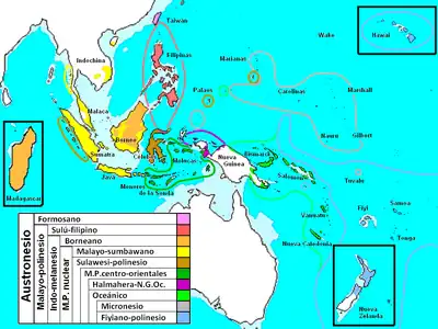 Las lenguas austronesias constituyen una familia lingüística formada por más de 1250 lenguas[3] que se distribuyen entre la isla de Madagascar, el archipiélago malayo y Oceanía.[4] El nombre de la familia deriva del término griego austronesia, 'islas del sur'.