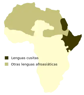 ![]() Distribución de las lenguas cusitas (en verde oscuro) en África. En más claro, otras lenguas afroasiáticas.