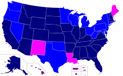 - Luisiana, el francés, en su variante cajún o acadiano, está legalmente reconocido.[11] El francés también es significativo en Maine, Nuevo Hampshire y Vermont.