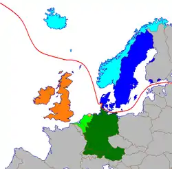 - Término que aparece en estudios lingüísticos sobre Escandinavia (Trabajo sobre la sintaxis del dialecto escandinavo. Consultado el 11 de noviembre de 2007), y que, en ocasiones, solo recubre el ámbito continental, i.e., danés, sueco y noruego